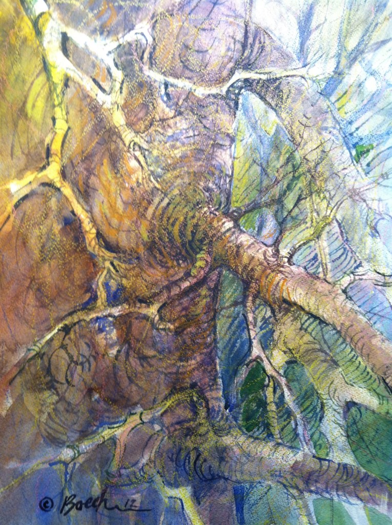 This painting was done on location on a day just like that. Sounds of songbirds filled the branches. The gnarly image stood firm. Vines had made their way around each one of those limbs, entwining, weaving and almost choking the roots below. It’s not much to look at anymore, but the beauty remains. Life goes on, even in the darkest hours. We don’t know what lies ahead. Our future is stagnant in our own eyes. We dream of and wish for more than we have and yet we have more than we know.