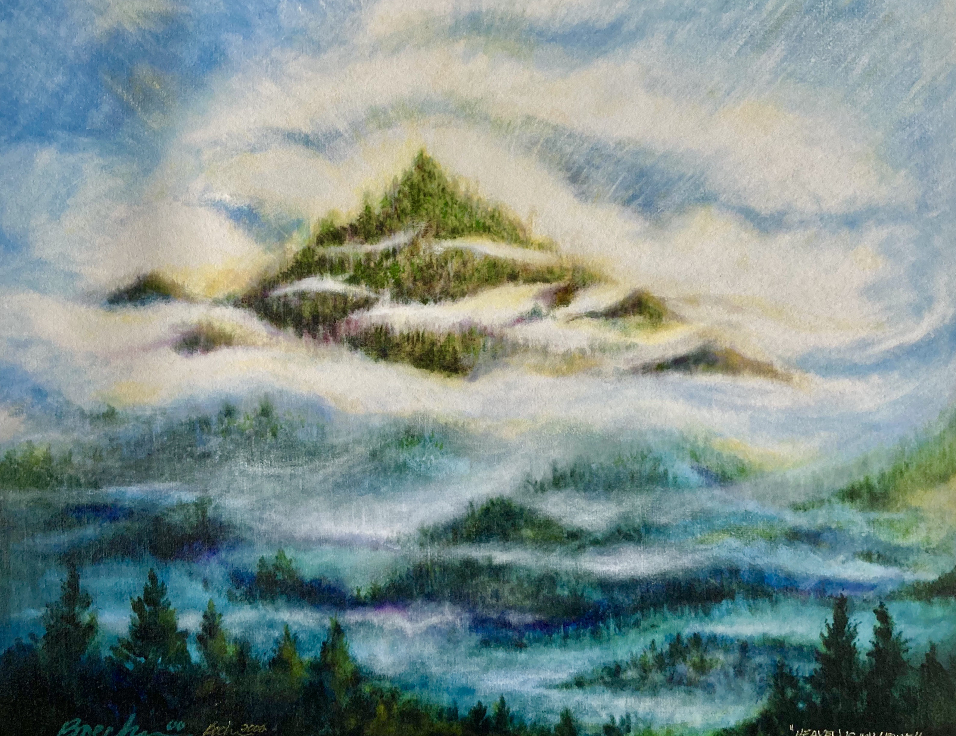 This painting was completed in 1989 by Paul Boecher after returning from a hunting trip in Oregon. He was not here when his mother passed, but in what appeared to be a heavenly valley in the mountains. That picture remained in his mind until he reached home. It now resides in a church office at King of Grace Lutheran Church in Golden Valley. The title of the painting is “Heaven is my Home,” and truly conveys the beauty waiting for all the believers that trust that they will be there someday.