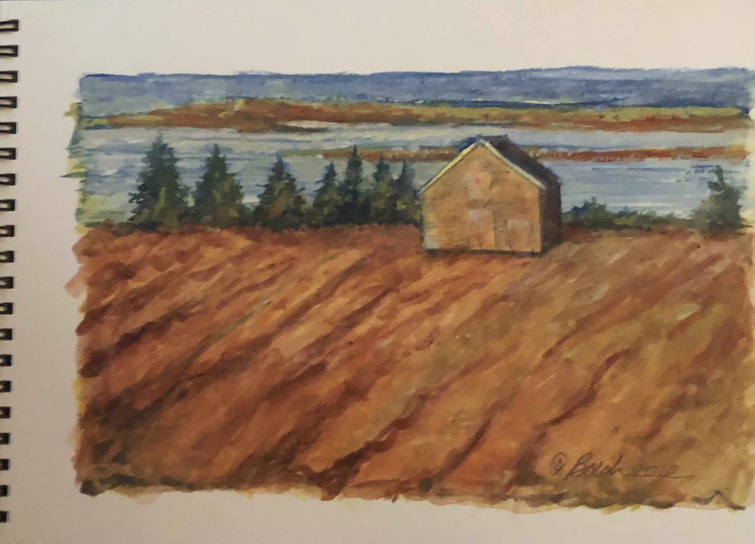 This watercolor painting was done on site. Looking at this landscape shows the determination of American farmers as we see the deep ruts, indicating where seeds have been laid. The little house looks lonely set behind the massive foreground. Can you imagine the beautiful view from that miniscule house? Beautiful pine trees lining a river that runs swiftly by them. It makes me wonder who lives there? When the land was bought, there were dreams of future families sprouting up across the acreage. Whoever inhabited the place may have never ventured outside that property except to go to town once a month to purchase supplies needed. There are several little farms left. Many in disrepair, and some apparently unoccupied. Each of them holds a history. They may have been members of a church community even though they were separated by miles from each other and their church.