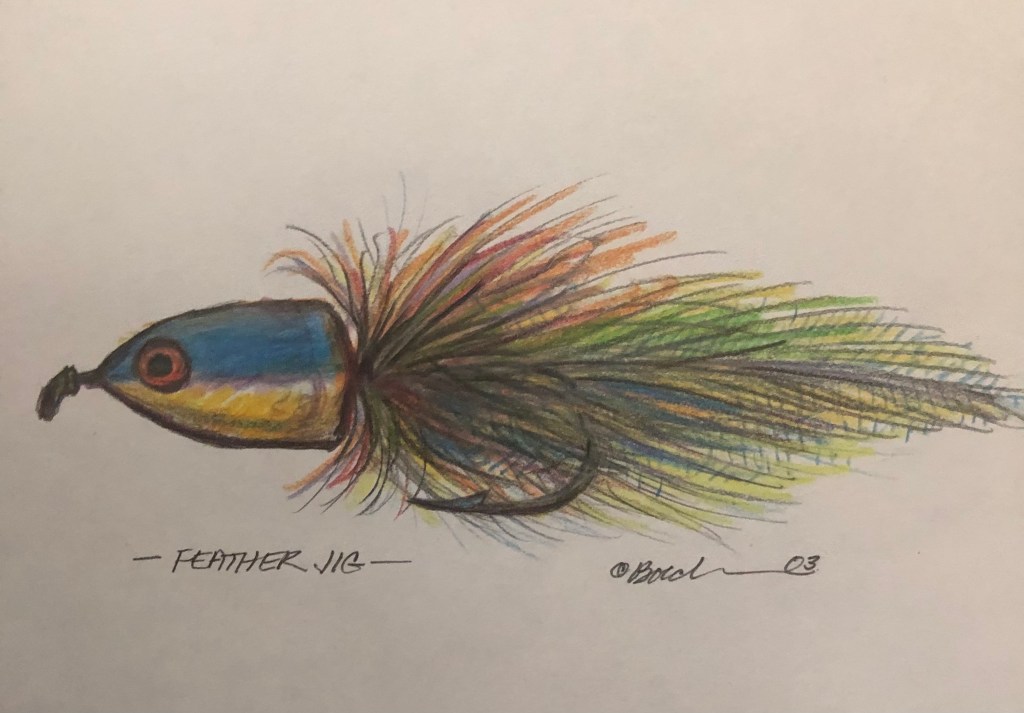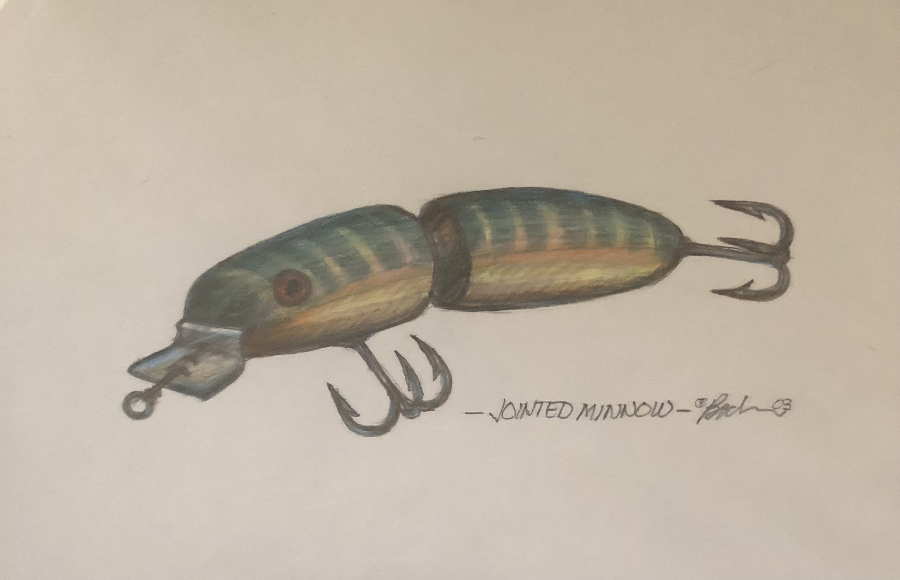 Paul was well acquainted with fishing. His family owned a summer home on a Wisconsin lake and fishing was a requirement. When I think of fishing, my thoughts turn to baiting a hook with a fresh, juicy earthworm. That alone was enough to deter me from enjoying the fun of landing a huge bottom feeder with an ugly face. The detailed drawings of fishing lures would seem a lot easier solution to ever having to handle said worm. This collection shows some of the contents of his dad’s bait box