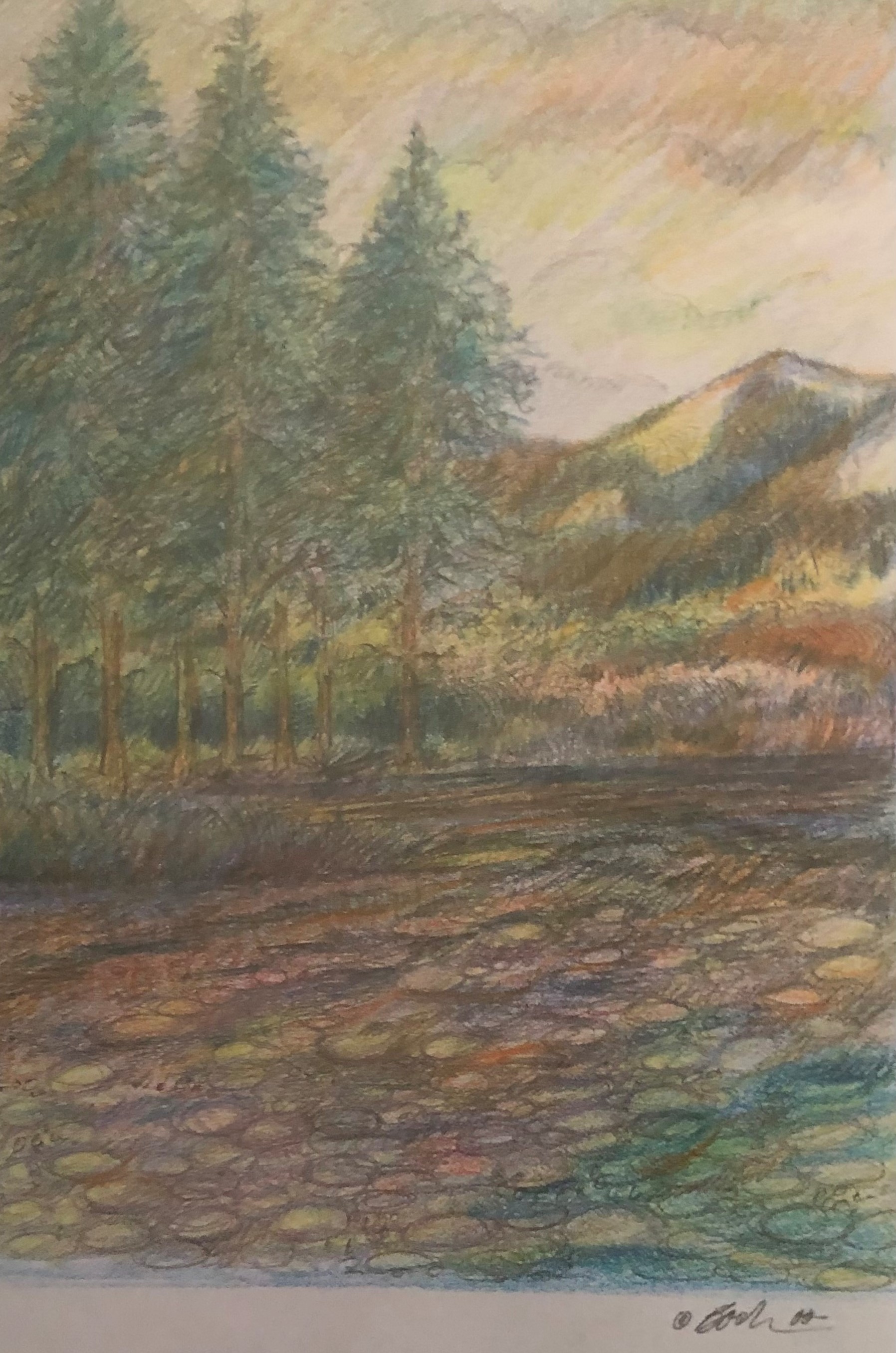 The art of observation is a talent in itself. I looked at this one and saw a cobblestone walk in a wilderness environment. It set my mind to wondering if someone may have lived on the edge of that river. What happened to his home? Apparently, he made a place to shelter himself, complete with field stones surrounding it. Did he have a family? Was he a loner, making a new life for himself in the west? My imagination swelled as I looked deeper into the painting. I immediately had a whole different story to observe. It could have been a lake loaded with lily pads. I could almost hear frogs croaking in unison as their chorus welcomed the day. The way we look at things can change in a second. The mystery that Paul created in each of his works is evident in this one. The morning sun, rising over each crevasse of the mountain range, sifting through magnificent pines, gives a peaceful feeling to this painting. What do you see?