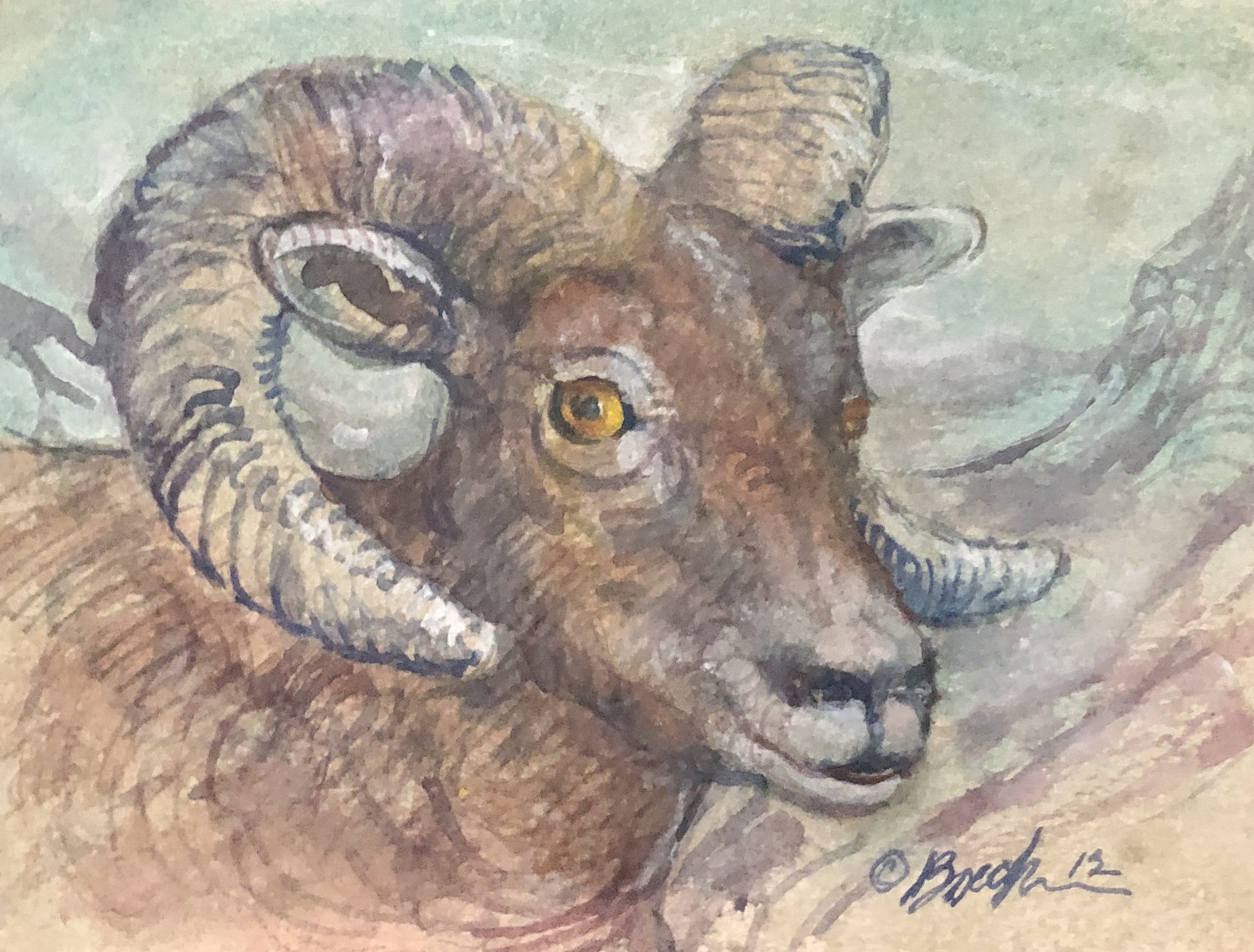 Today’s art is a watercolor pencil sketch, with so much amazing detail. The eyes are focused on us as we watch him. Paul created art that was so often connected to a story. He moved around a lot when he made art. One friend commented that his brush seemed to move faster than his brain. You can see a lot of motion in this piece. Just like our lives are filled with movement and energy, this Big Horn Sheep looks like he’s ready to jump off the page. All of God’s creatures, great and small, require vim and vigor – including us.