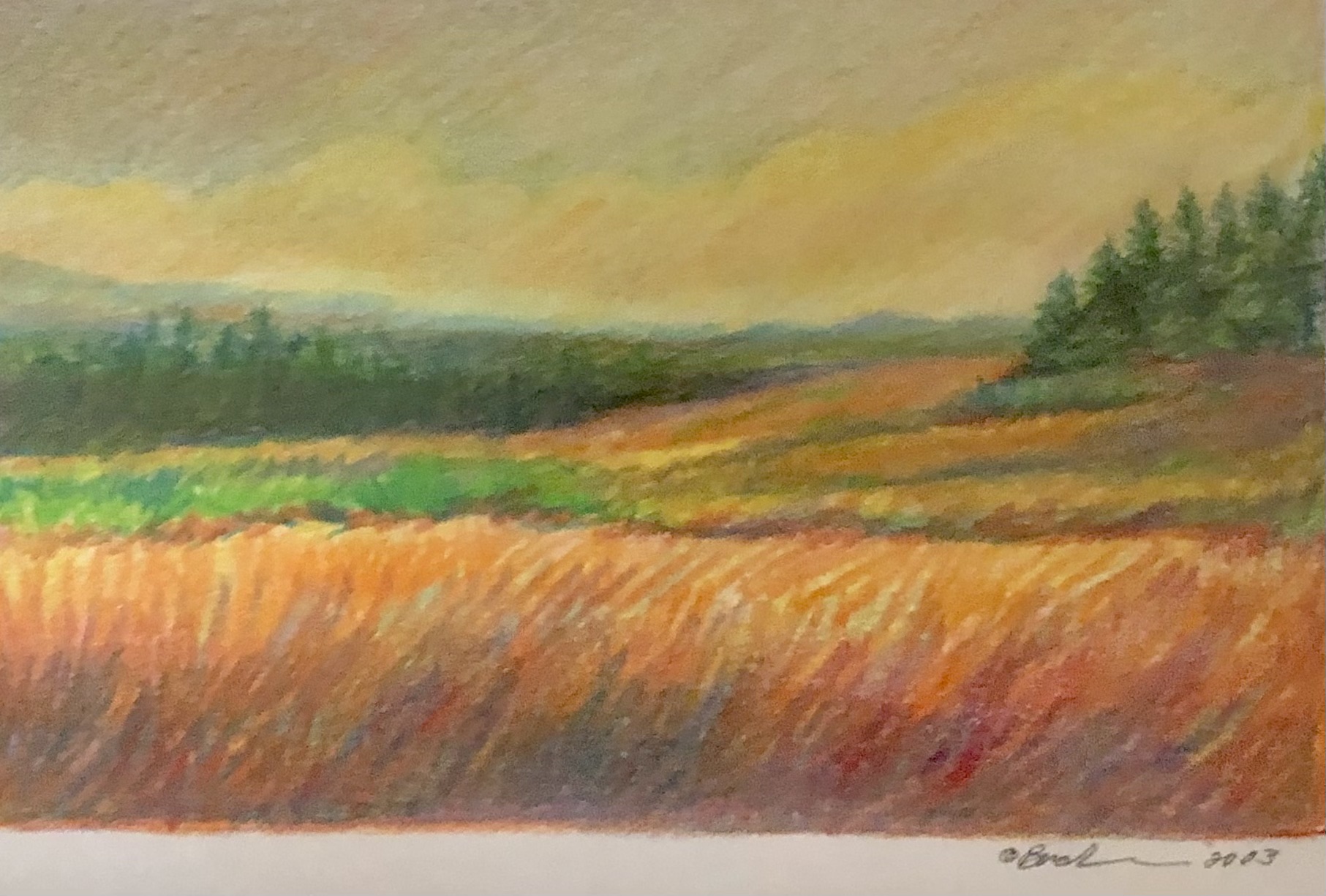 Another summer is coming to a close. That means the end of vacation time for many. It also indicates the beginning of the school year. Not only that but it’s a time for thoughts of harvesting and bringing in the sheaves. The oil pastel today shows a field ripe for garnering. The hue of the golden wheat is almost a foreshadowing of a totally new season. With all the ugliness in our world today, we must look at the good that’s out there. There are still those who live by the land. There are those willing to make sacrifices for their livelihood. There are those who continue to carry faith in their hearts for a loving God, who won’t let them down. Our hope must remain. Our determination comes from our Creator. Our lives depend on Him.