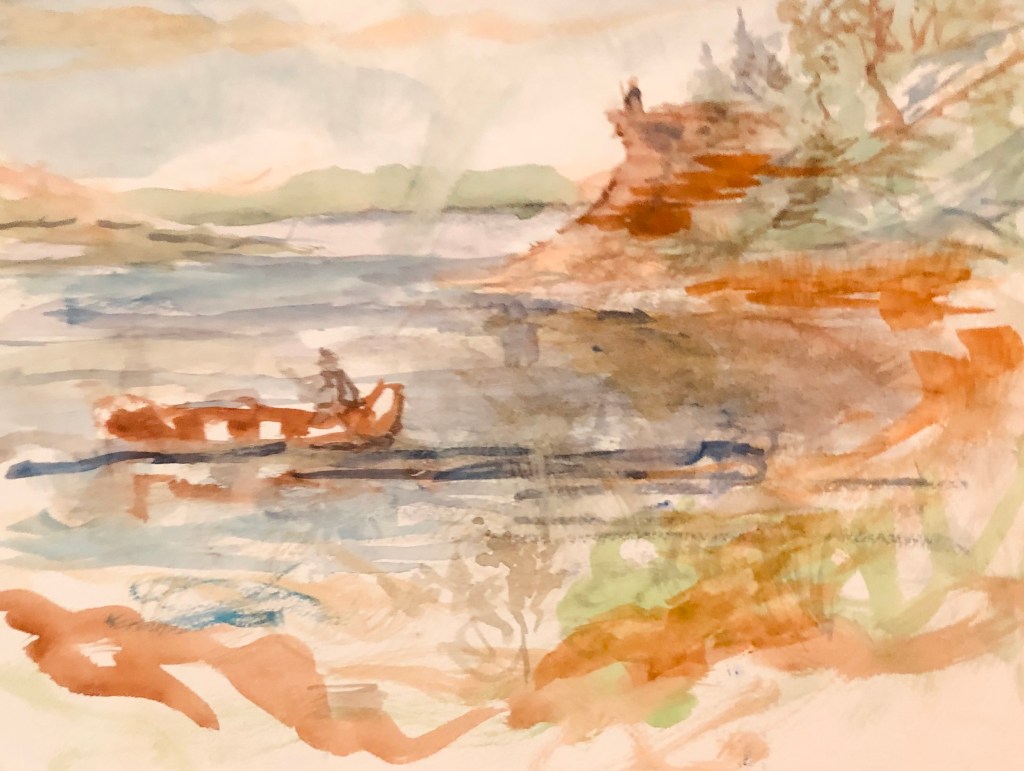 This watercolor tells the story about the winding down of summer. The canoe presses on as bright colors begin to replace the many shades of green. A person guiding the boat is enjoying the view while another is perched on a cliff doing the same. There is so much to see in autumn. It’s also September 1st – Labor Day – the beginning of the school year – new challenges and adventures and the turning of the calendar eight times since the loss of my precious Paul. As I look back at the year so far, I wonder how I’ve been able to walk this road. Each month has brought another “first” to my mind. Each brings a few tears – not of sadness – only joy. Everyone grieves differently. The memories remain. This month brings thoughts of change, discovery, adventure, love and US. Knowing that Paul is free from pain and continuing to do God’s work in heaven has been my greatest comfort. I look forward to the day we will be reunited.
