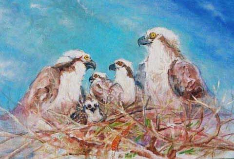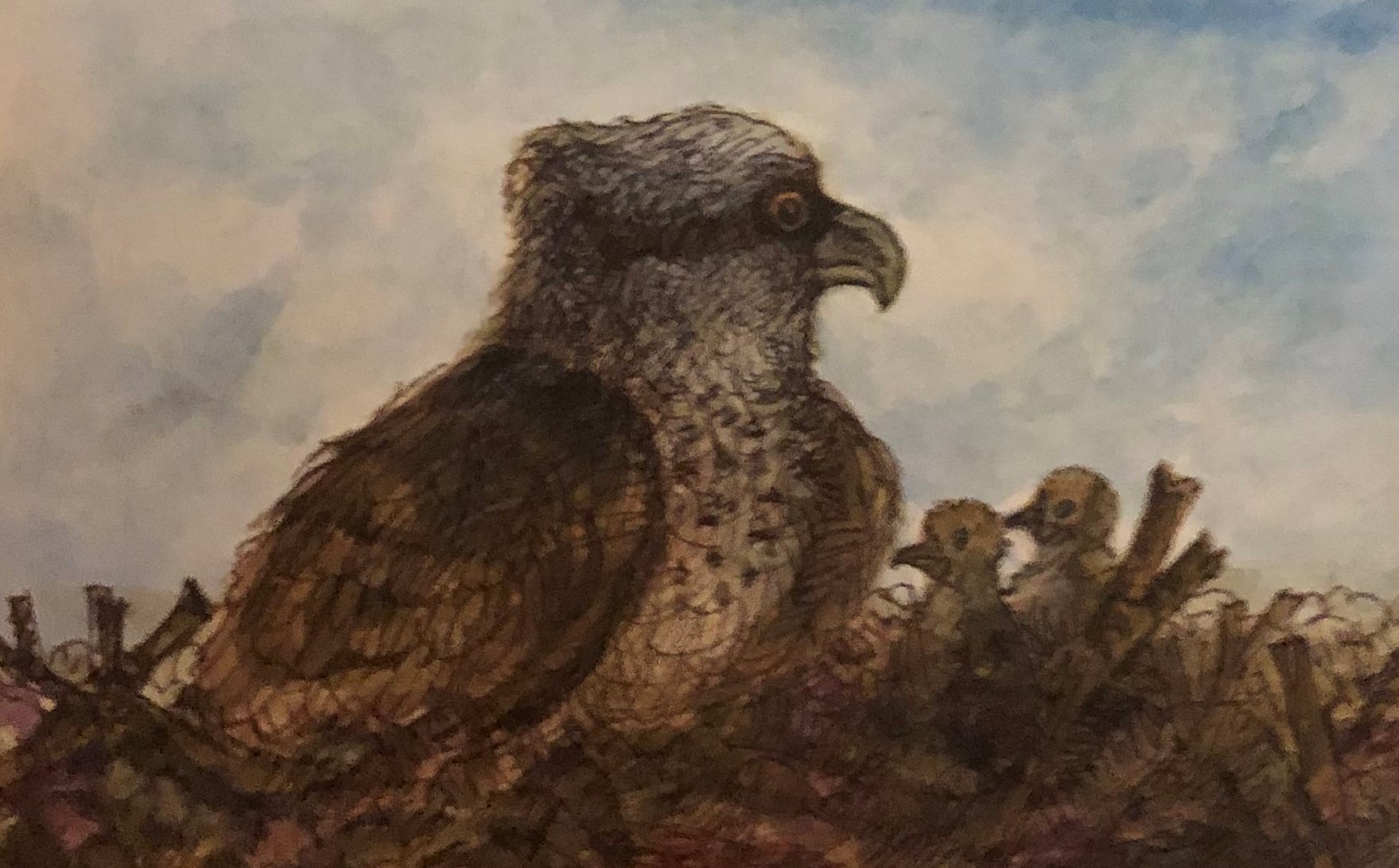 This is a familiar acrylic painting that Paul crafted over a period of time observing a family of Osprey as the went from one male and one female – to 3 eggs – to 3 chicks – to 2 fledglings and one loss. Their family developed over a period of months. Paul was on a study of sorts, with a few other observers. Each day they would meet at the Coon Rapids Dam, set up equipment to photograph, paint or just observe these magnificent water birds. They watched as the nest was crafted out of all sorts of things, including twigs and other objects to hold it tightly together as a resting place for the coming eggs that would be laid carefully and tended until the chicks hatched. There was even a dog collar embedded in the enormous nest. The expedition kind of went south when the men couldn’t come together on how to present their findings. Would it be in the form of a book? Would their observations be presented to other bird watchers? Not being able to reach a decision, they all went their own ways. Paul started with several sketches. The fun was had in the time together and the bond that these men made with each other and nature. The stories have been left untold, but I have a visual reminder of the event in this magnificent painting.