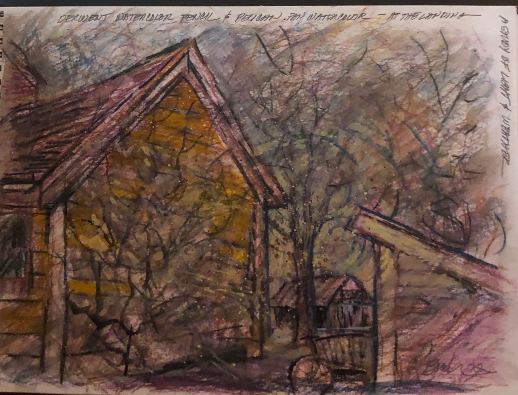 This piece was done with watercolor pencil and watercolor paint at the Landing in Shakopee, MN on the Minnesota River. Paul participated in a reenactment of an 1800’s landscape artist from that time period. This place is covered with history. Being a river town, it soon began to fill up with buildings, stores, a school and church and homes for several who used the river for transporting their wares to other cities. Farmers, storekeepers, clergymen, families from various parts of the world came there to find their American dream. Today, this lovely addition to the Three Rivers Park System is a refuge from the big city life that churns and bustles nearby. Paul always considered himself an 1800s kind of guy. He loved the history of that time period and the persistence of the people to make a living just to stay alive. He would don his costume and spend a weekend with other reenactors, portraying life during that time in history. The painting was done as a testimony to one of the buildings in the park. The simplicity of lines, color, light and movement are a contrast to the lives of people today, They worked very hard to make a living. From dusk to dawn, time would be spent in the fields, milking cows, building houses, forging horseshoes, preparing a sermon or going to school for the young’un’s. I imagine life today would be completely foreign to what happened then, but someone had the foresight to preserve these communities so that we could view history in the making.
