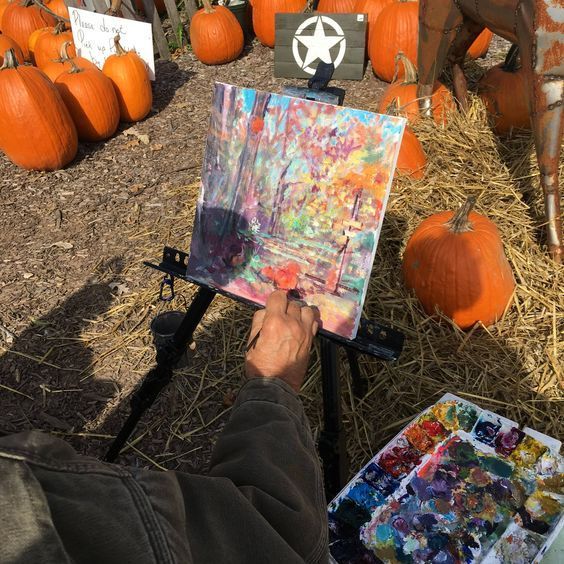This is an unusual autumn for us Minnesotans. We’ve been known to have blizzards in October, which leave us helpless and isolated. We’ve also experienced tornados and thunderstorms. This year we’ve been enjoying unseasonably hot and humid temperatures. All of which sets my allergies on fire. I am grateful I have air conditioning in my car and home. I look forward to getting the flannel out of storage and warm cuddly sweaters. While I wait, I am always finding another painting which characterizes Paul’s talent as an artist for all seasons. This painting was done with his class of plein air painters. The intimate little group would always come up with amazing art, especially when God was actively adding His paintbrush to the green trees and underbrush. You can see Paul’s hand in this photo, putting some finishing touches on an acrylic painting on canvas within a pumpkin patch.