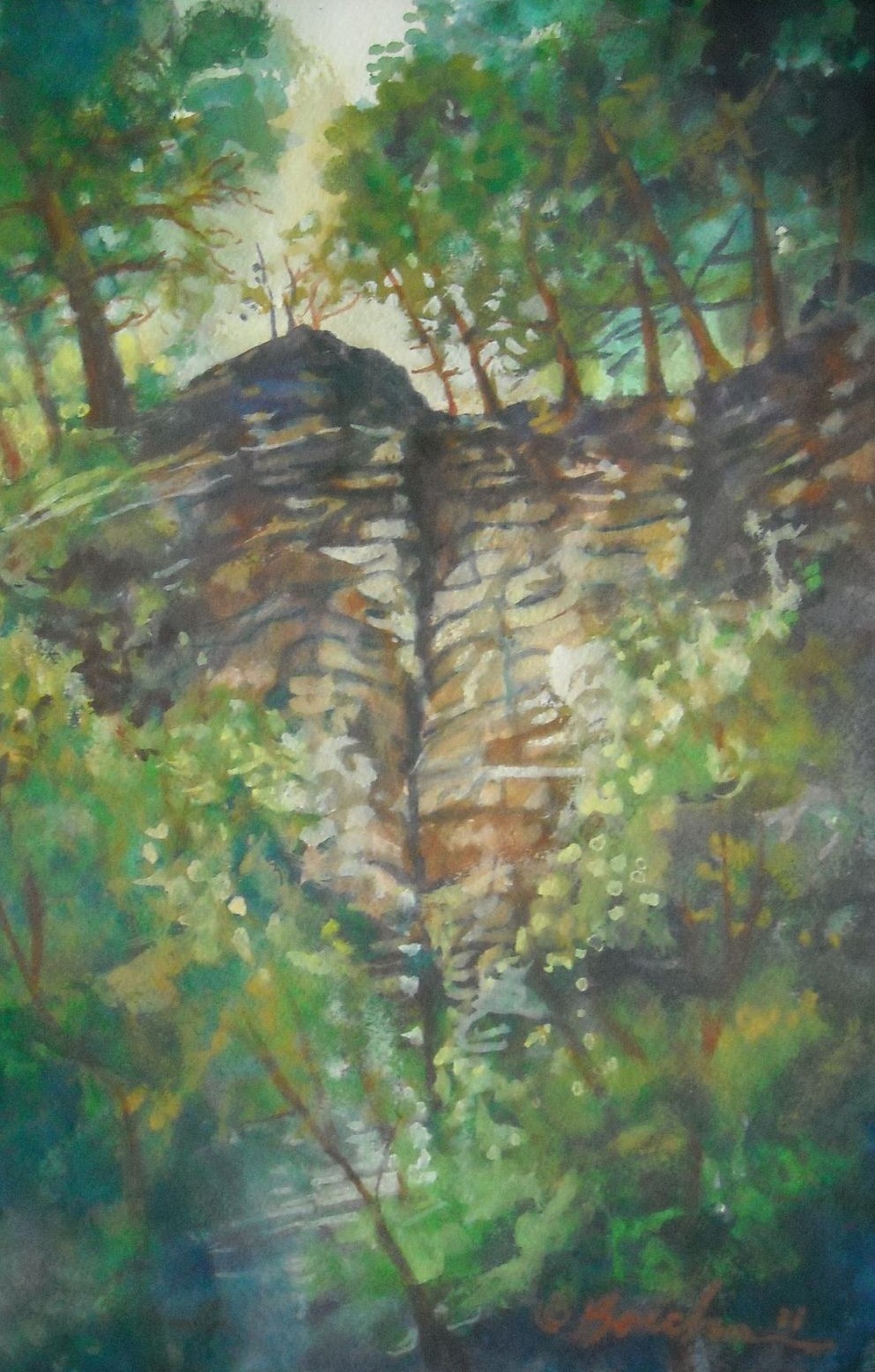 This piece was probably painted in Wisconsin. The bluffs lining the St. Croix River Valley look much like this and are always a piece of eye candy as you enter the state. It amazes me to see these rock formations, yet God is so much more than amazing. He carved these spaces either during the time of creation, or possibly as the waters of Noah’s flood cut through solid rock, washing away surrounding mountains. The power of that flood had to be immense. Up until that time in Bible history, there was no rain. The atmosphere acted like a giant terrarium as the land was watered from the bottom up. The force of that water surging from the inside of the land along with the pouring from above was strong enough to create a source of power to be reckoned with. I also am inspired by these cliffs housing our country’s bird, who almost met with extinction. They now soar to great heights and often build their nests in these spaces.