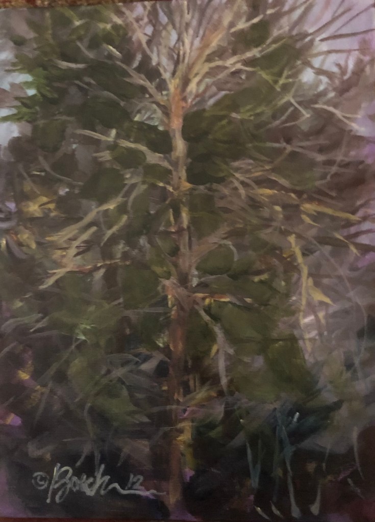 Memories of my own childhood reminded me of my dad’s version of cutting down the tree. He would wait until the day before Christmas and get the last tree on the lot for the best price ever. My sister and I would fill all the empty spots with tinsel and ornaments as dad sat in his chair, directing the entire process. The painting today is a look at a perfect Christmas Tree, without all the trimmings. Fridays might be “black” to some, but the Friday I’m reminded of is called “Good” Friday. On that day, our Savior, Jesus, was nailed to a tree. He suffered and died there so that the entire world would gain eternal life. That’s why we call it “Good” Friday.