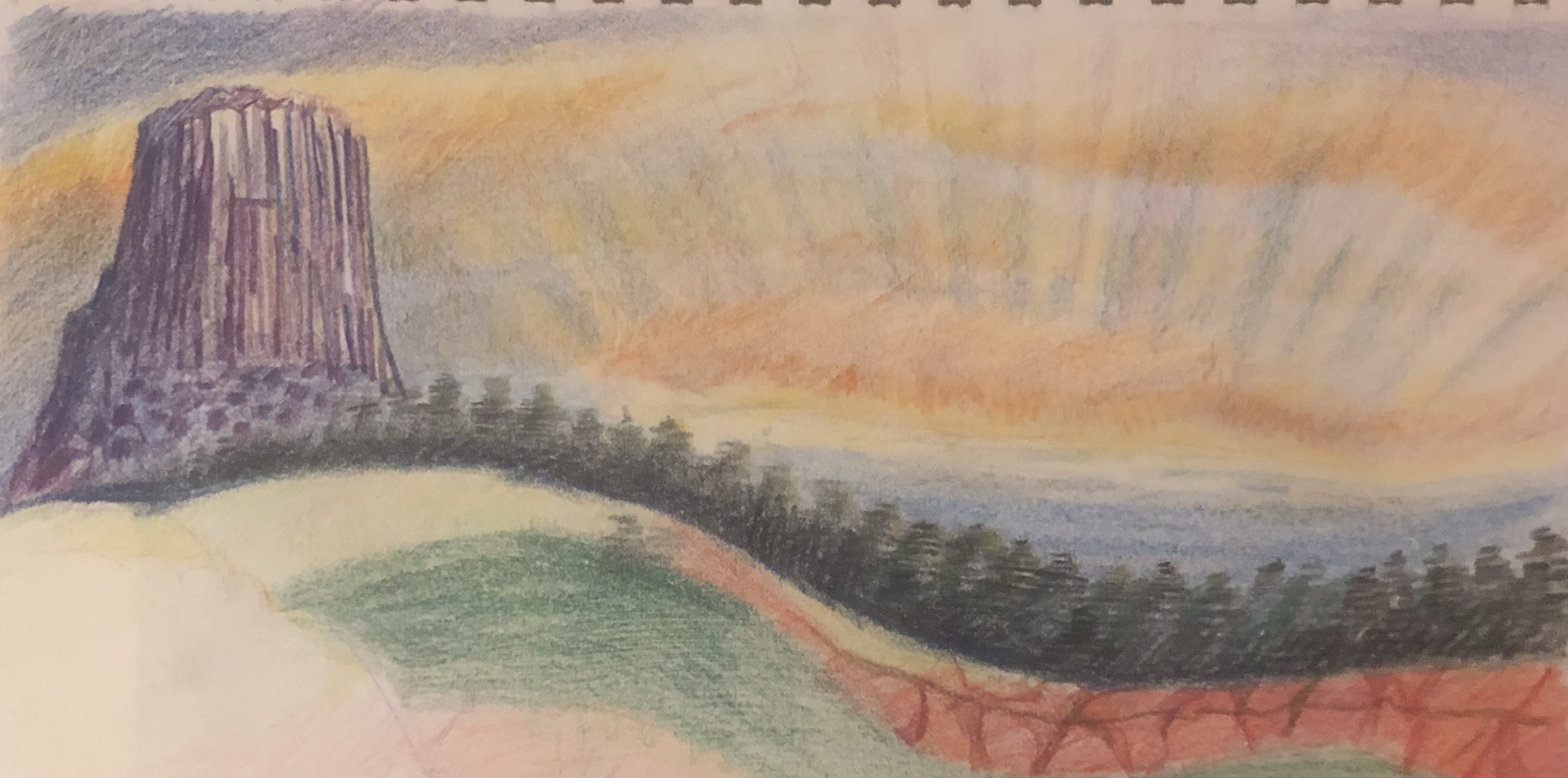 This colored pencil sketch is of a familiar sight for those who have traveled through Wyoming. Imagine what the first pioneers thought of this ominous looking butte popping up from the ground. The first inhabitants of the area named it Bear’s House or Bear’s Lodge. Several other names were attributed to the butte by indigenous tribes. In 1875, during an expedition led by Richard Irving Dodge, an interpreter mistakenly gave Dodge the name “Bad God’s Tower.” It officially was named Devils Tower. In the 21st century, there was a call to rename it because it was assumed it was offensive to some. Whatever the name, it is another of God’s interesting creations that often surprises those who see it. The sketch includes the rising of the sun and makes me think about the Advent of Jesus, the Son that would be born in Bethlehem to fulfill the Creator’s promise of salvation. The intricate lines and details, mingled with the movement of the scene, represents the process of fulfilling that prophesy. God has a plan for each one of us. The complex design of that plan is something only God can make happen. Thank you, Jesus, for another day.
