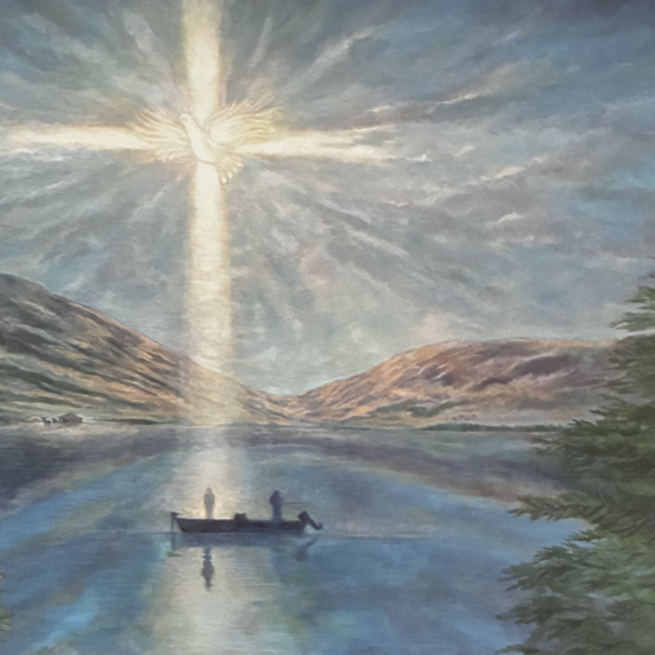 The painting today was commissioned several years ago by a woman who wanted to donate a memory of her husband to the church. It reminds me of a place of comfort and peace – a habitat in which to get away from the ugliness of the world. I believe that God must cry over the condition of our planet, our country, our cities, our homes and even our churches. Since we have been created in His image, tears are part of who we are. We cry when we’re happy, sad, angry, outraged. We cry when we’re in pain. We cry when we realize that our lives are in a state of change which we have no control over. Jesus wept. Even though He could end the pain He felt, He suffered through it. He wept.