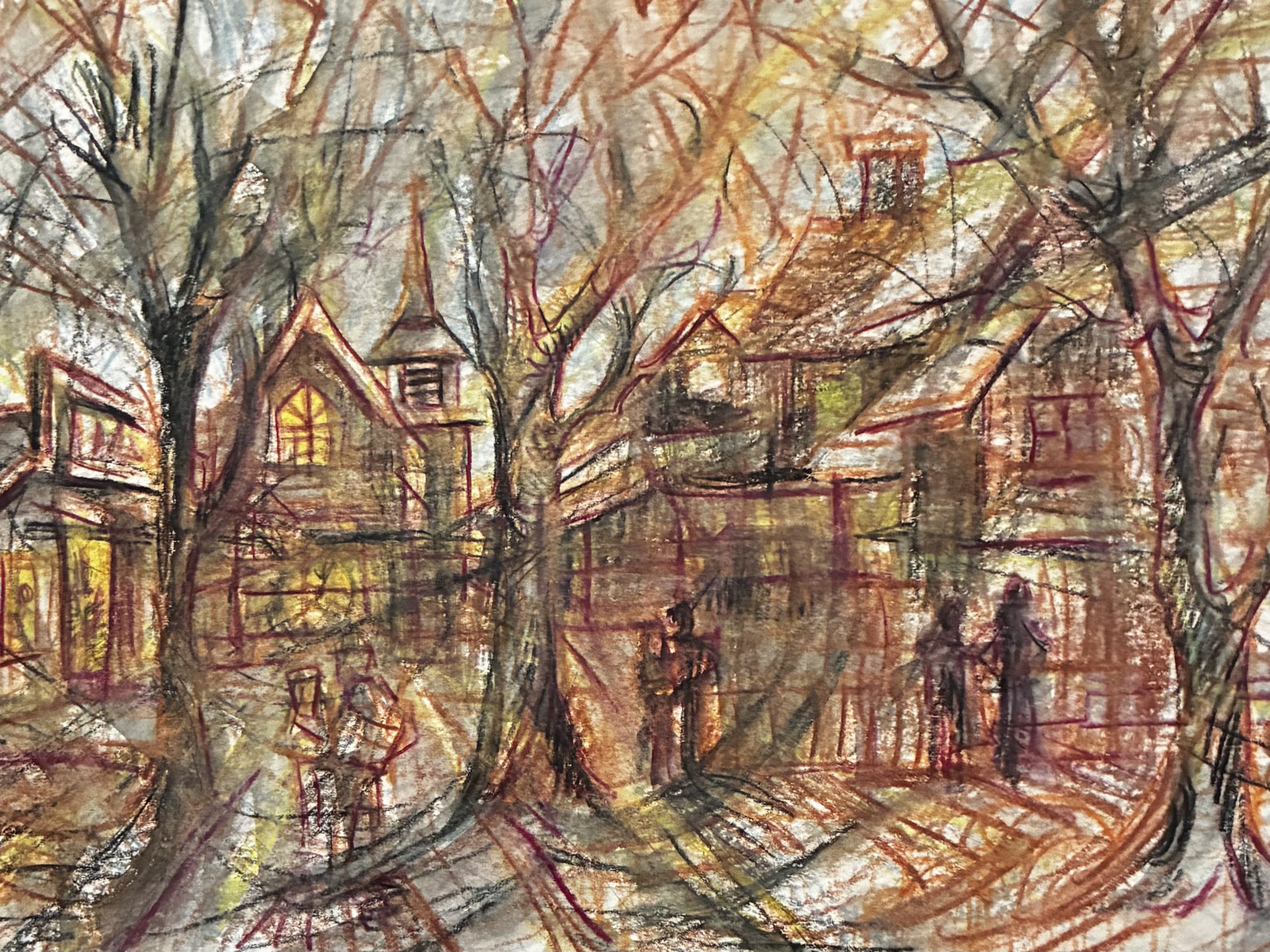 Taking a trip back in time has been in the back of minds for many years. The thought of erasing all the ugliness and evil of current events is naturally appealing. This watercolor pencil sketch crafted by Paul shows in detail the way things might have been a hundred and fifty years ago. There were churches on just about every street corner, along with a bar or two peppered in between. Cities were constructed by manpower rather than through the Industrial Revolution. They lasted longer than most current buildings do. People weren’t afraid to leave their homes unlocked when they went outside. Neighbors took the time to chat for a while and sincerely ask how you were doing, without running away before you told them. Community was strong and people cared about each other. I’m not saying that doesn’t exist today, but we seem to have drifted further apart during those intermittent years.