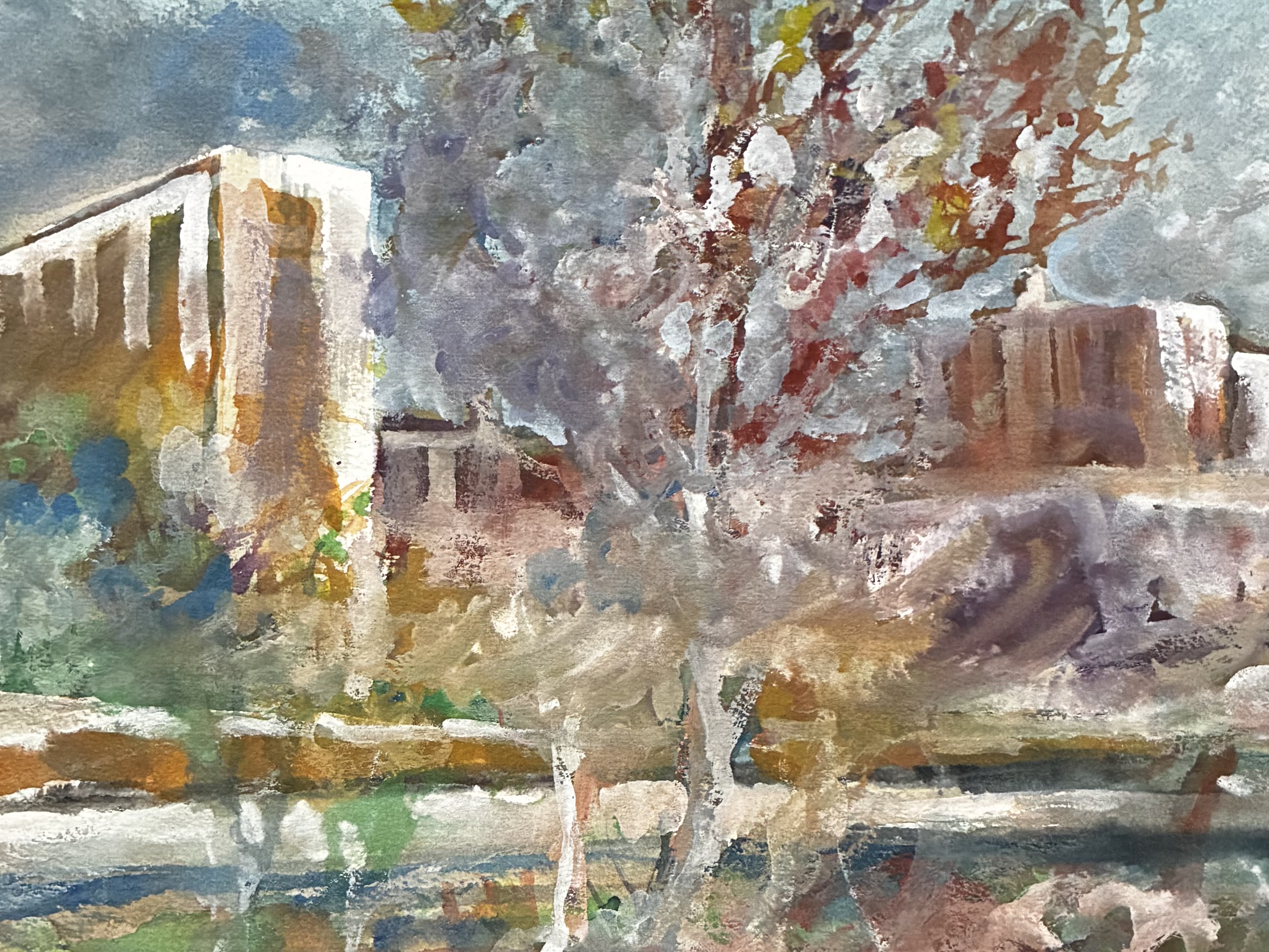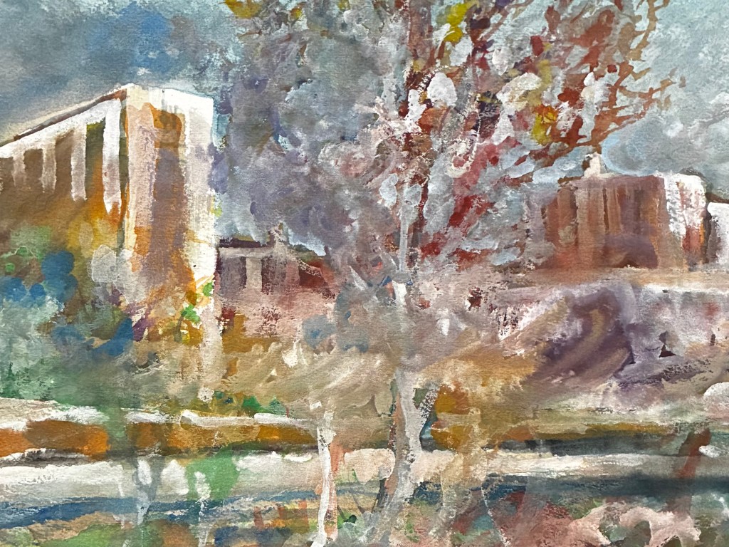 The painting I’ve chosen for today is a watercolor depicting a winter day in the city. The buildings, the trees, the grounds are covered with a coating of ice and a dusting of snow. It makes me think of C.S. Lewis’ world of Narnia. Of course, that was a fantasy world of which fairy tales are made, but I believe that there is such a place where the promise of green pastures abides. Where all our needs are provided for us at no cost. Where peace and contentment reign. Where there is no sin, no darkness, no hate, no pain, no lack of good. We cannot begin to imagine such a place. It is the eternal paradise that God intended for mankind in the beginning.