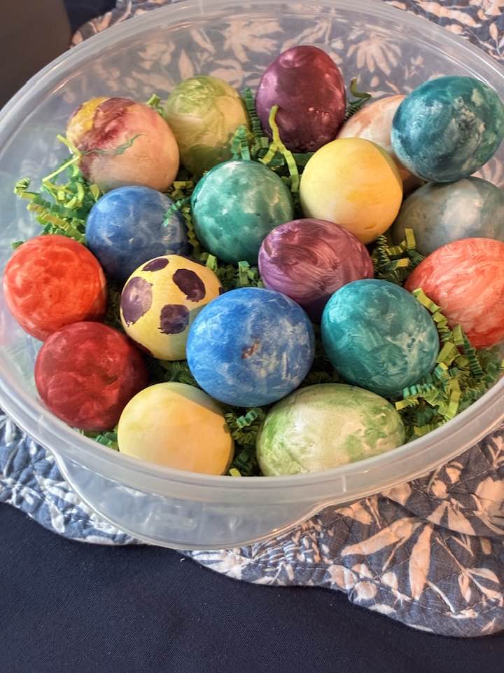 This year I brought my hand painted Easter eggs to the church breakfast. I believe the price of eggs last year was like $7. a dozen. They would’ve been considered golden eggs. My watercolor paint box was open, so I filled my brush with brilliant colors and began adding to each of those hard-boiled eggs. They were much prettier than the ones I used to make with my children, but even those memories hold a special place in my heart. The eggs were consumed and enjoyed, but the colors transferred to fingers and made for interesting conversation.