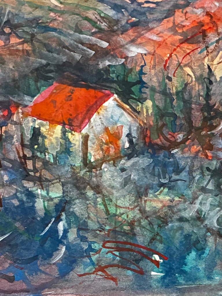 This Paul Boecher watercolor is painted in the style of Van Gogh. The multiple strong brush strokes depict turmoil, confusion, a little chaos and an impressionistic flavor. Much art is a reflection of how we fee or what;s going on in our heads. When those things occur in our lives it’s best to run to God than away from Him. He has all the answers to our questions. He helps us solve problems that we cannot begin to figure out. He lifts us out of the pit when we might feel like we’re drowning. He restores our confidence by giving us His Holy Spirit to build our faith. His omniscience, omnipresence and omnipotence are available for us every day. Set your eyes on Him and He will help you see.